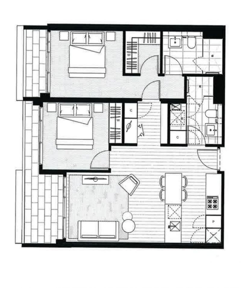 The apartment comprises two spacious bedrooms, both with balconies. One bedroom features mirrored built-in robes (BIR), while the master bedroom boasts an ensuite bathroom and a walk-in robe. The central bathroom includes an oversized shower and face-level storage. A European-style laundry adds convenience, and the entertainer's kitchen is equipped with a gas stove top, dishwasher, integrated fridge, stone bench tops, ample storage, and bench space. A study nook makes working from home easy, and the light-filled living room, with glass sliding doors, opens up to an oversized balcony-perfect for enjoying your morning coffee.